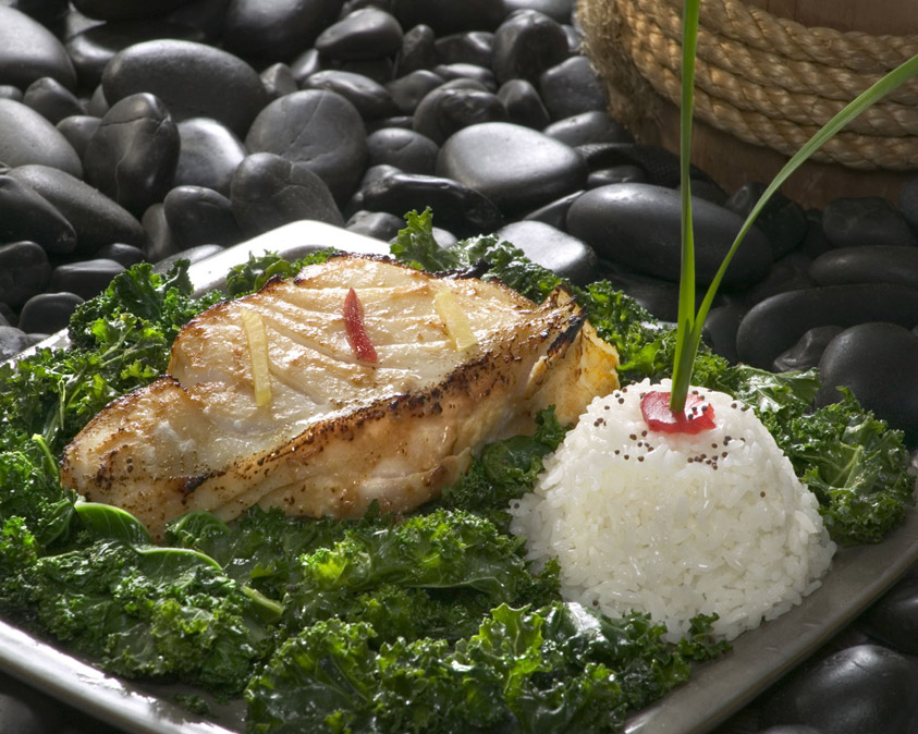 Miso Crusted Chillean Sea Bass on a bed of sautéed Kale, with Garlic Chives & Steamed Rice Cake with Chinese Red Ginger