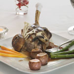 Grilled Veal Chop with Wild Mushrooms & Demi Glace, Baby Roast Potatoes, Baby Carrots & Steamed Asparagus